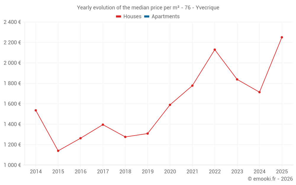 The median price on the 15 house transactions of the last 24 months in the municipality of Yvecrique was 1 732 € per square meter for a median property value of 155 000 €. Over this period, 60% of transactions were between 1 483 and 2 005 € per square meter (from the 2nd to the 8th deciles).