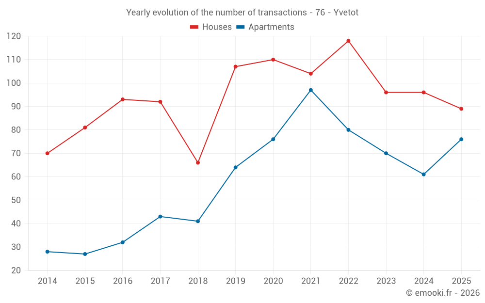 The median price on the 24 house transactions of the last 3 months in the municipality of Yvetot was 2 098 € per square meter for a median property value of 181 500 €. Over this period, 60% of transactions were between 1 732 and 2 566 € per square meter (from the 2nd to the 8th deciles).