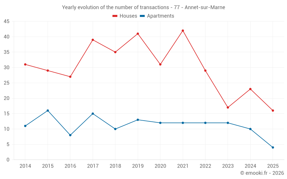 The median price on the 29 house transactions of the last 12 months in the municipality of Annet-sur-Marne was 3 413 € per square meter for a median property value of 360 000 €. Over this period, 60% of transactions were between 2 521 and 3 893 € per square meter (from the 2nd to the 8th deciles).