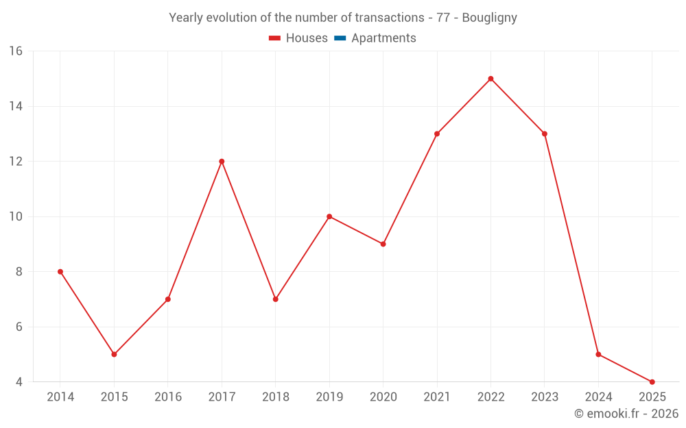 The median price on the 16 house transactions of the last 24 months in the municipality of Bougligny was 1 678 € per square meter for a median property value of 190 000 €. Over this period, 60% of transactions were between 1 359 and 2 213 € per square meter (from the 2nd to the 8th deciles).