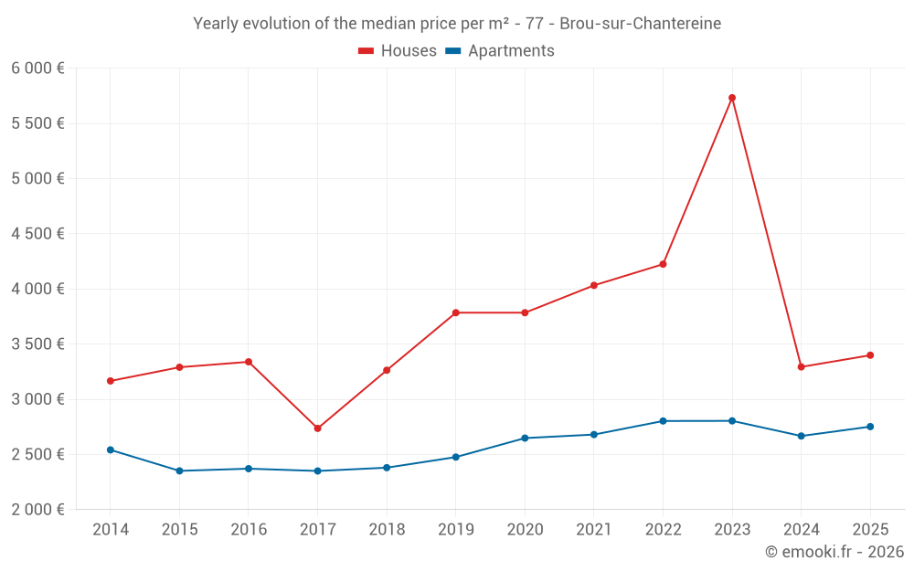 The median price on the 21 house transactions of the last 24 months in the municipality of Brou-sur-Chantereine was 3 317 € per square meter for a median property value of 305 000 €. Over this period, 60% of transactions were between 2 779 and 4 808 € per square meter (from the 2nd to the 8th deciles).