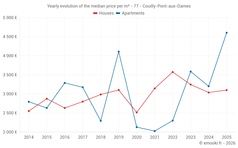 The median price on the 18 house transactions of the last 12 months in the municipality of Couilly-Pont-aux-Dames was 3 123 € per square meter for a median property value of 315 000 €. Over this period, 60% of transactions were between 2 594 and 4 197 € per square meter (from the 2nd to the 8th deciles).