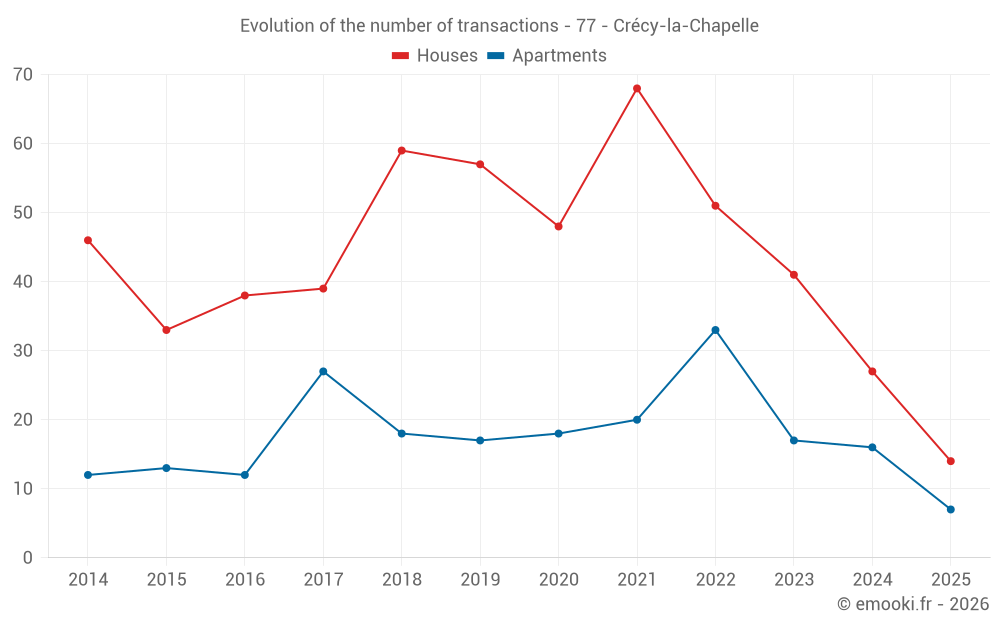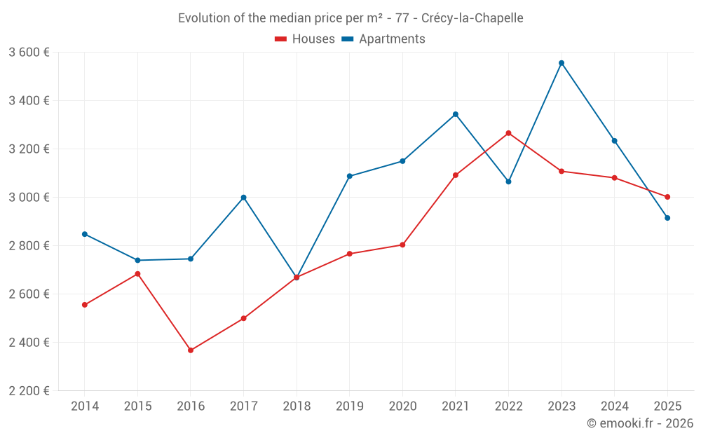 The median price on the 34 apartment transactions of the last 24 months in the municipality of Crécy-la-Chapelle was 3 296 € per square meter for a median property value of 147 918 €. Over this period, 60% of transactions were between 2 897 and 3 771 € per square meter (from the 2nd to the 8th deciles).