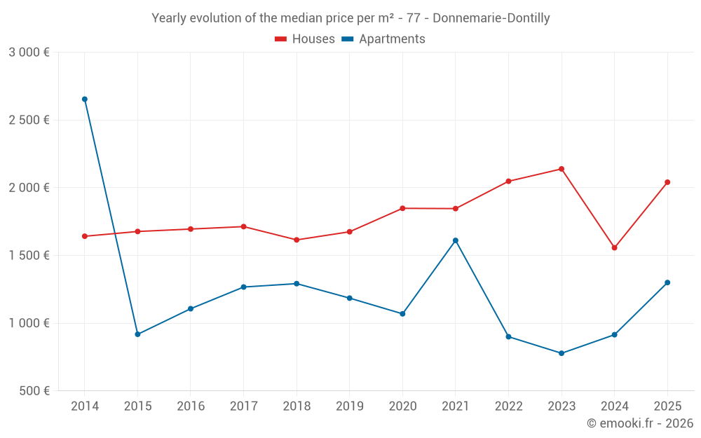 The median price on the 22 house transactions of the last 12 months in the municipality of Donnemarie-Dontilly was 1 642 € per square meter for a median property value of 188 000 €. Over this period, 60% of transactions were between 1 174 and 2 389 € per square meter (from the 2nd to the 8th deciles).