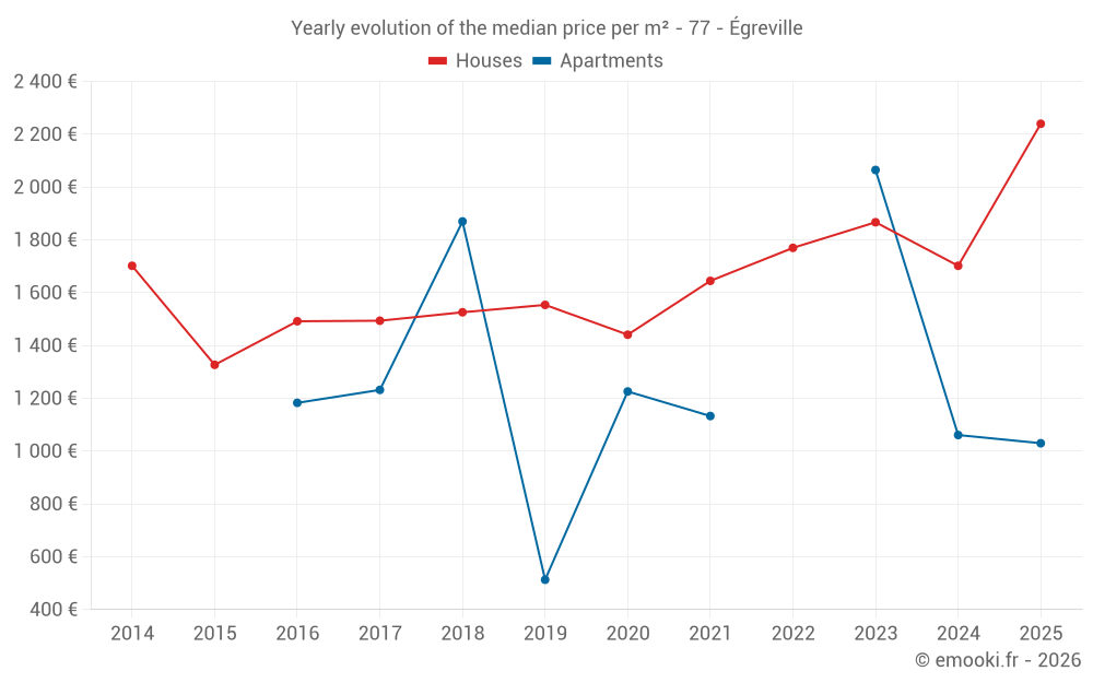 The median price on the 22 house transactions of the last 12 months in the municipality of Égreville was 1 718 € per square meter for a median property value of 180 000 €. Over this period, 60% of transactions were between 1 375 and 2 236 € per square meter (from the 2nd to the 8th deciles).