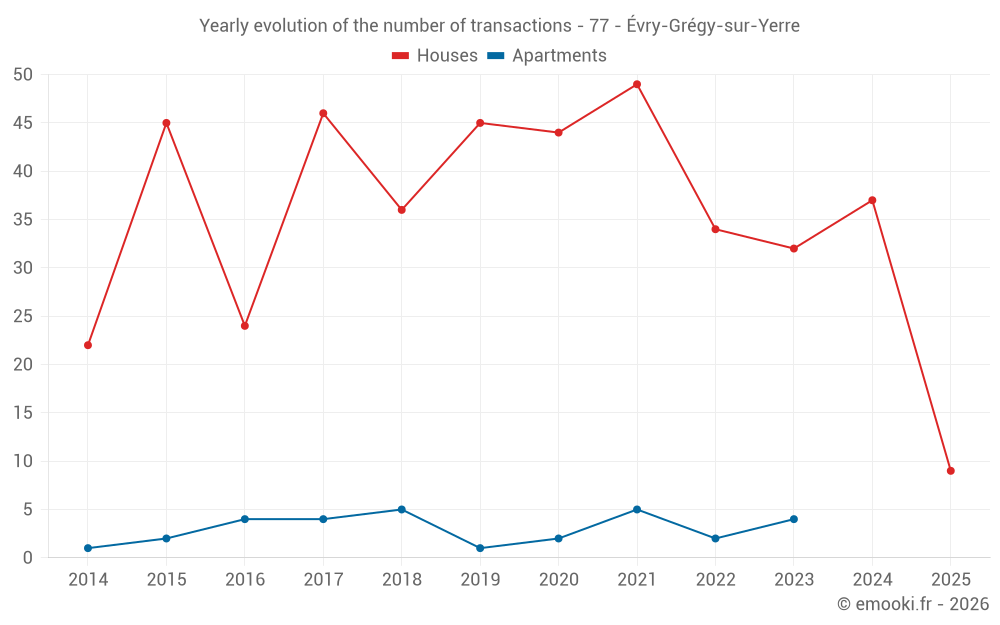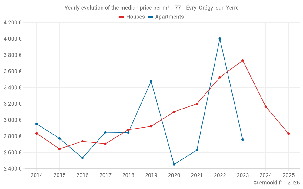 The median price on the 31 house transactions of the last 12 months in the municipality of Évry-Grégy-sur-Yerre was 3 110 € per square meter for a median property value of 353 850 €. Over this period, 60% of transactions were between 2 577 and 3 733 € per square meter (from the 2nd to the 8th deciles).