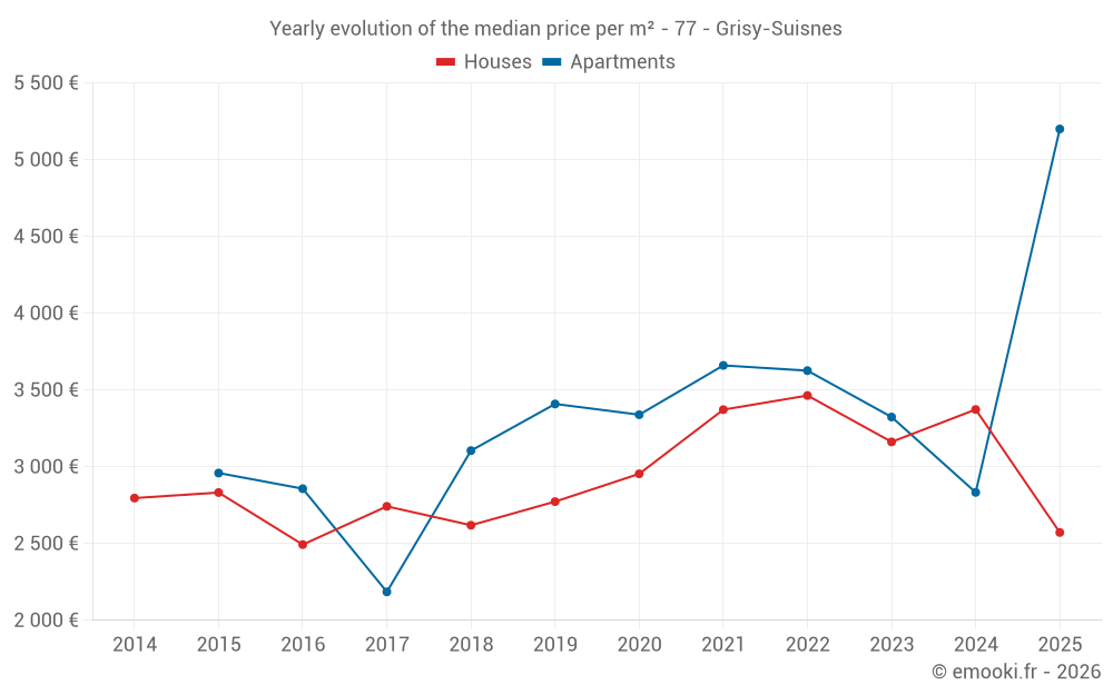 The median price on the 23 house transactions of the last 12 months in the municipality of Grisy-Suisnes was 3 048 € per square meter for a median property value of 310 000 €. Over this period, 60% of transactions were between 2 287 and 3 633 € per square meter (from the 2nd to the 8th deciles).
