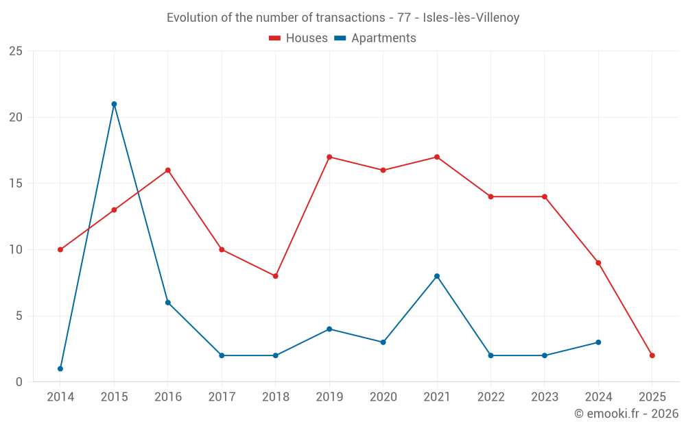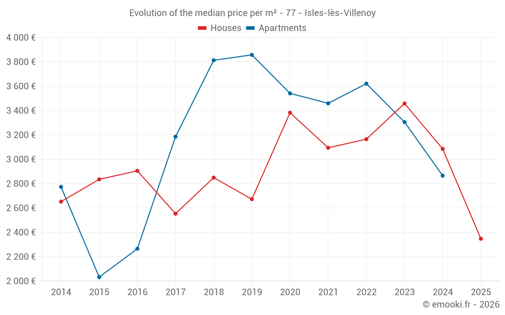 The median price on the 19 house transactions of the last 24 months in the municipality of Isles-lès-Villenoy was 3 105 € per square meter for a median property value of 390 000 €. Over this period, 60% of transactions were between 1 797 and 3 859 € per square meter (from the 2nd to the 8th deciles).