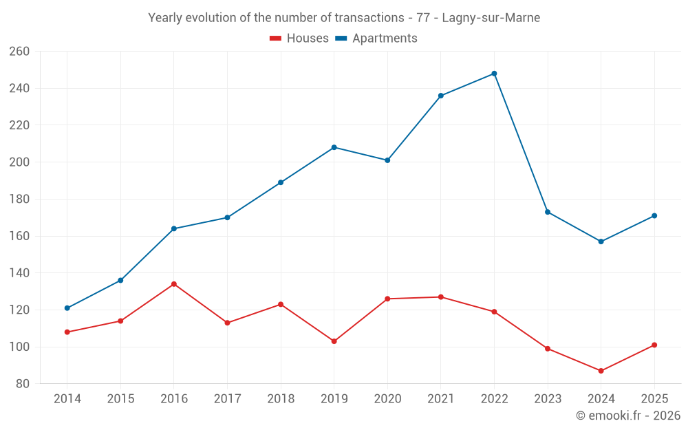 The median price on the 24 house transactions of the last 3 months in the municipality of Lagny-sur-Marne was 3 634 € per square meter for a median property value of 408 550 €. Over this period, 60% of transactions were between 2 945 and 4 620 € per square meter (from the 2nd to the 8th deciles).