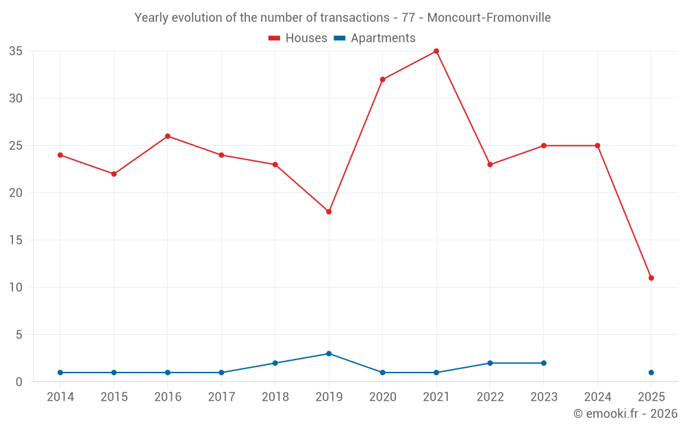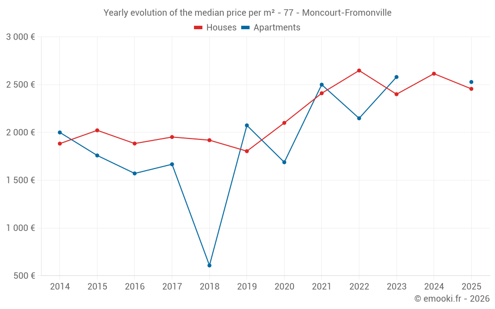 The median price on the 28 house transactions of the last 12 months in the municipality of Moncourt-Fromonville was 2 598 € per square meter for a median property value of 252 500 €. Over this period, 60% of transactions were between 1 730 and 3 165 € per square meter (from the 2nd to the 8th deciles).