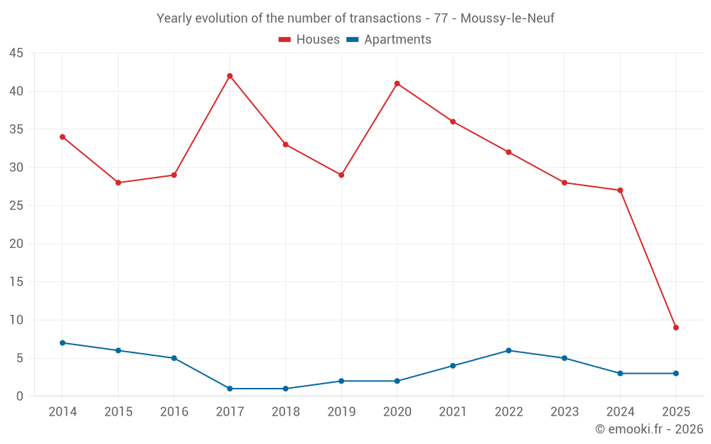 The median price on the 19 house transactions of the last 12 months in the municipality of Moussy-le-Neuf was 2 966 € per square meter for a median property value of 300 000 €. Over this period, 60% of transactions were between 2 589 and 3 342 € per square meter (from the 2nd to the 8th deciles).