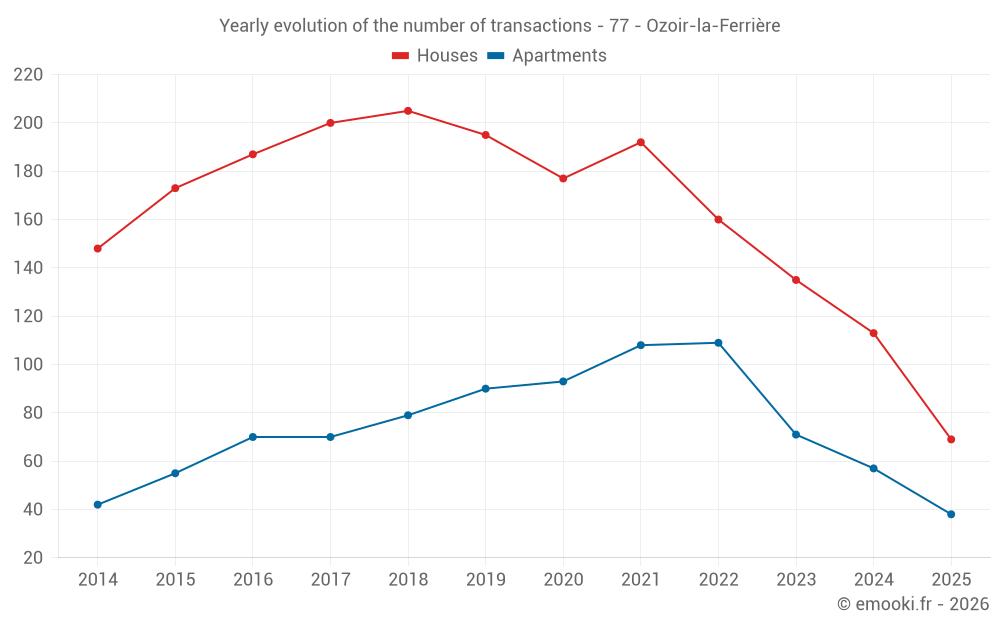 The median price on the 38 apartment transactions of the last 6 months in the municipality of Ozoir-la-Ferrière was 4 002 € per square meter for a median property value of 186 950 €. Over this period, 60% of transactions were between 3 178 and 4 459 € per square meter (from the 2nd to the 8th deciles).