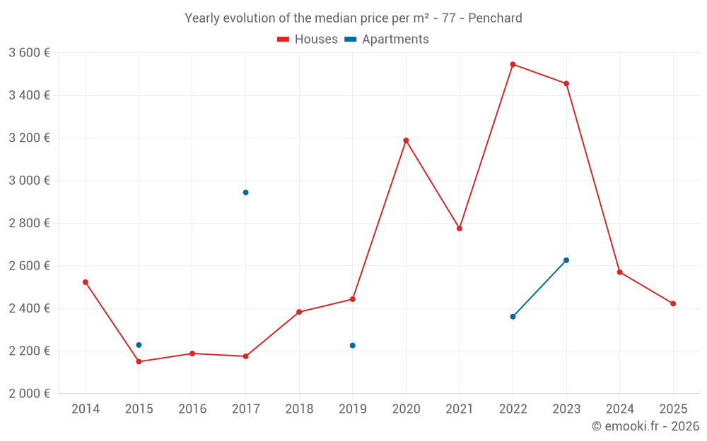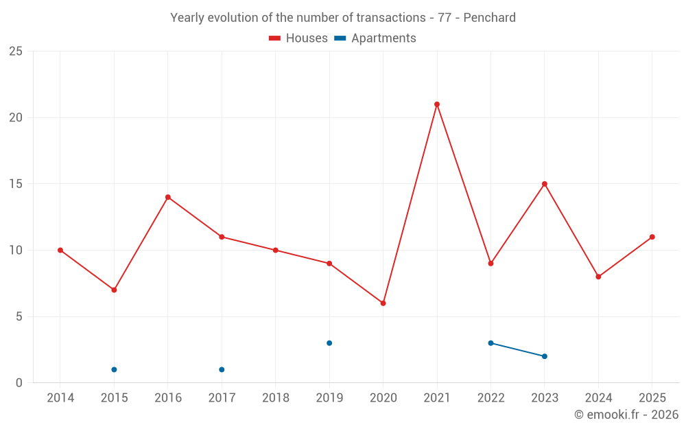 The median price on the 19 house transactions of the last 24 months in the municipality of Penchard was 2 525 € per square meter for a median property value of 240 000 €. Over this period, 60% of transactions were between 2 339 and 3 180 € per square meter (from the 2nd to the 8th deciles).