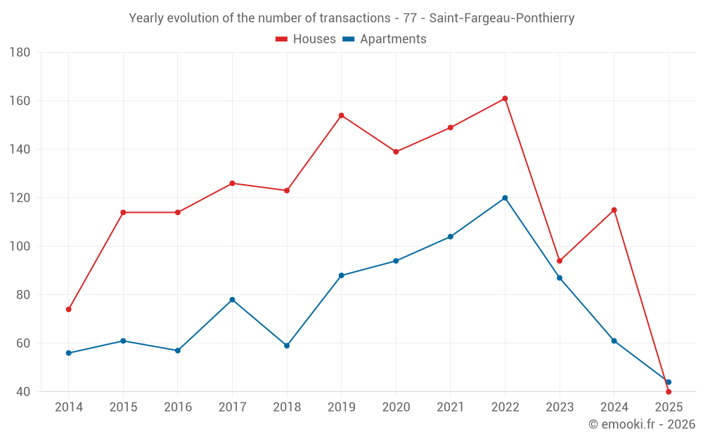 The median price on the 44 apartment transactions of the last 6 months in the municipality of Saint-Fargeau-Ponthierry was 2 902 € per square meter for a median property value of 129 140 €. Over this period, 60% of transactions were between 2 227 and 3 364 € per square meter (from the 2nd to the 8th deciles).
