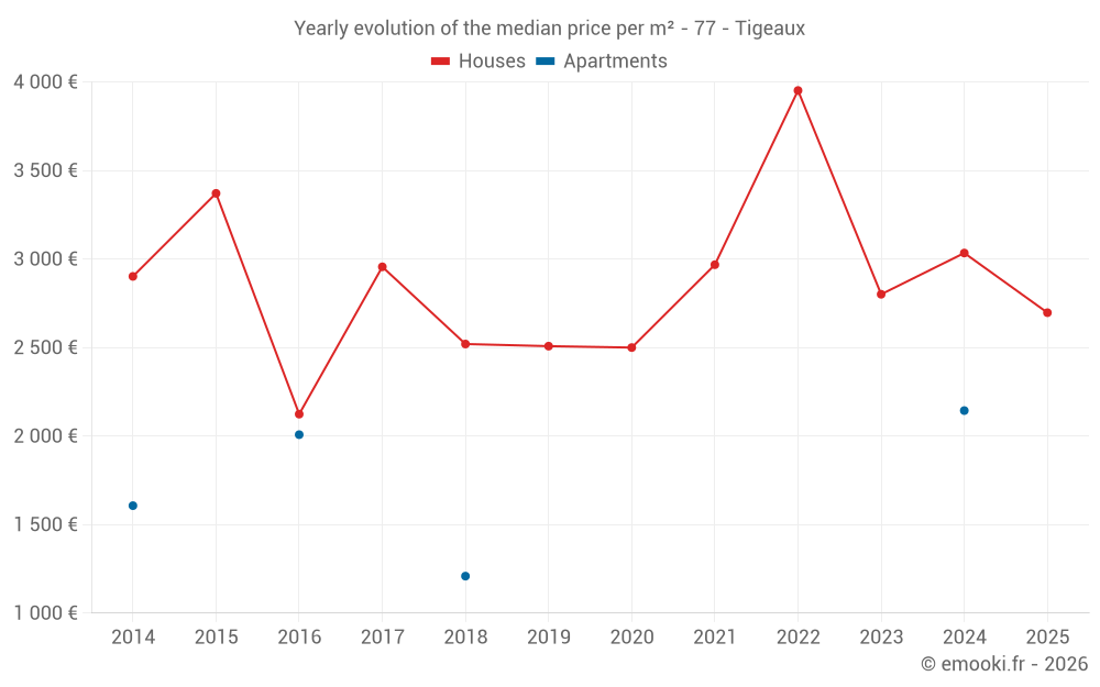 The price per m² of houses has decreased by 32% since 3 years, but it has increased by 27% in 9 years.
