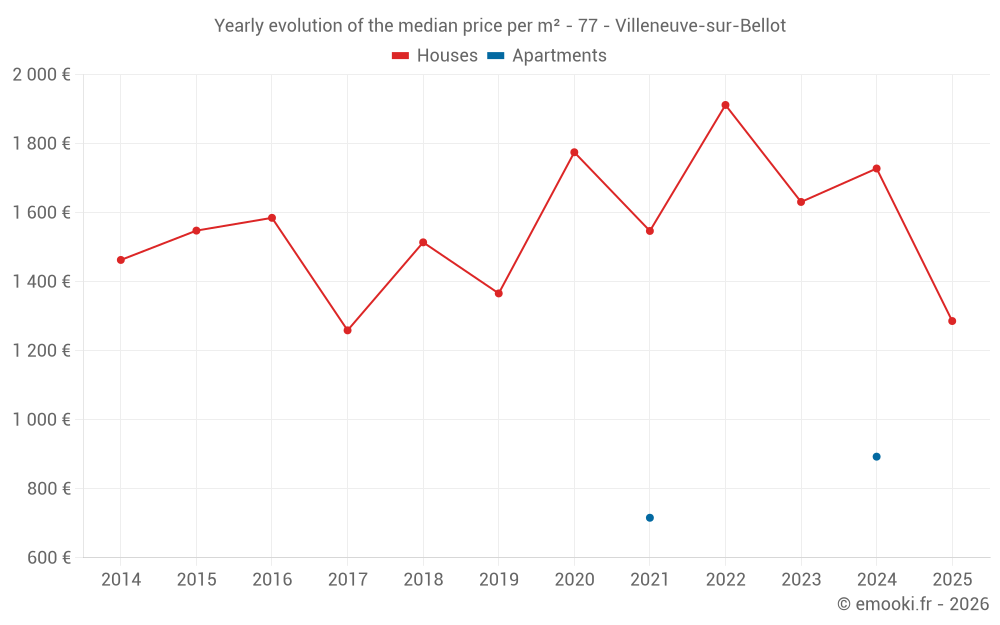 The median price on the 23 house transactions of the last 24 months in the municipality of Villeneuve-sur-Bellot was 1 728 € per square meter for a median property value of 155 000 €. Over this period, 60% of transactions were between 1 108 and 2 219 € per square meter (from the 2nd to the 8th deciles).