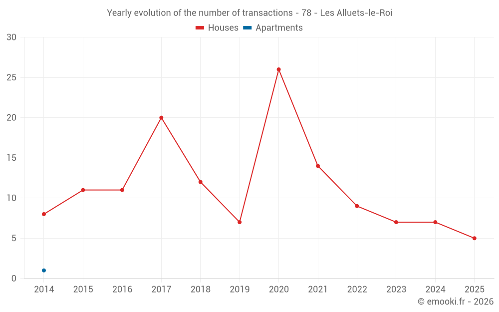 The median price on the 16 house transactions of the last 24 months in the municipality of Les Alluets-le-Roi was 3 894 € per square meter for a median property value of 441 000 €. Over this period, 60% of transactions were between 3 143 and 4 911 € per square meter (from the 2nd to the 8th deciles).
