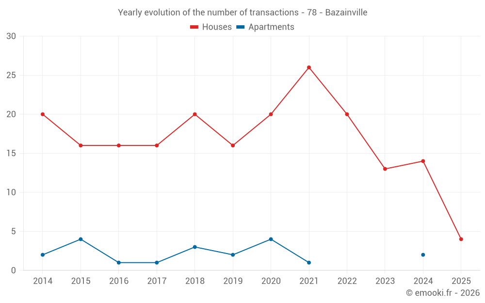 The median price on the 23 house transactions of the last 24 months in the municipality of Bazainville was 3 454 € per square meter for a median property value of 388 050 €. Over this period, 60% of transactions were between 2 588 and 3 957 € per square meter (from the 2nd to the 8th deciles).