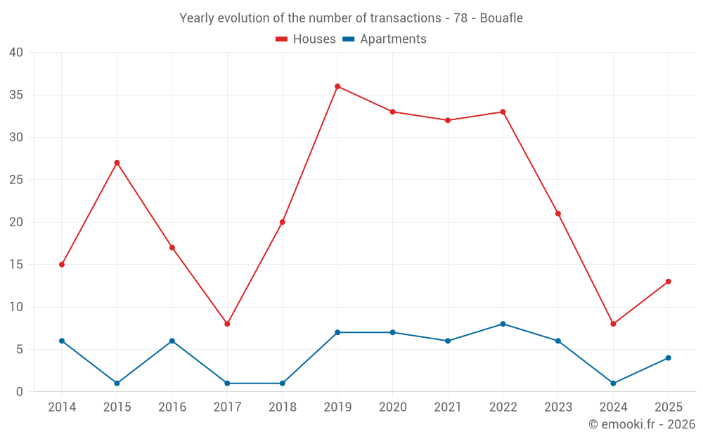 The median price on the 20 house transactions of the last 12 months in the municipality of Bouafle was 2 809 € per square meter for a median property value of 326 000 €. Over this period, 60% of transactions were between 2 061 and 3 657 € per square meter (from the 2nd to the 8th deciles).