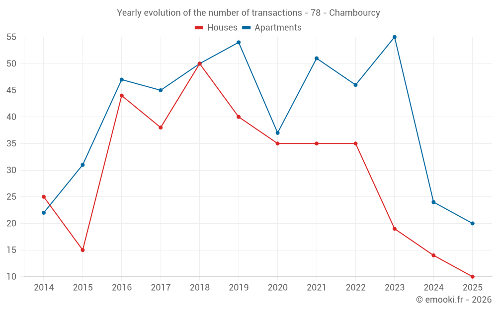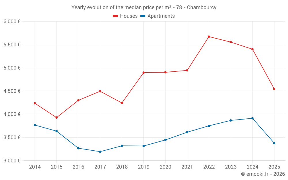 The median price on the 20 house transactions of the last 12 months in the municipality of Chambourcy was 4 788 € per square meter for a median property value of 683 800 €. Over this period, 60% of transactions were between 3 664 and 5 758 € per square meter (from the 2nd to the 8th deciles).