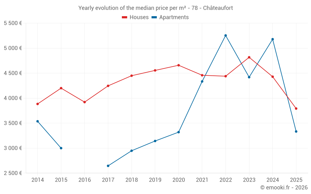 The median price on the 23 house transactions of the last 24 months in the municipality of Châteaufort was 4 638 € per square meter for a median property value of 552 550 €. Over this period, 60% of transactions were between 3 900 and 5 944 € per square meter (from the 2nd to the 8th deciles).