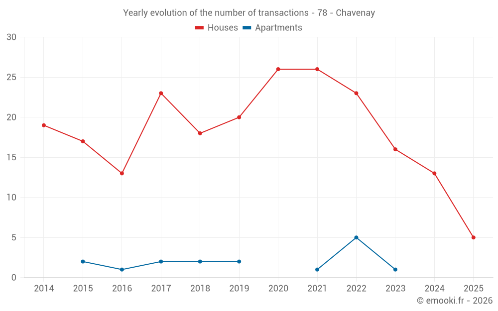 The median price on the 28 house transactions of the last 24 months in the municipality of Chavenay was 4 264 € per square meter for a median property value of 645 050 €. Over this period, 60% of transactions were between 3 021 and 5 095 € per square meter (from the 2nd to the 8th deciles).