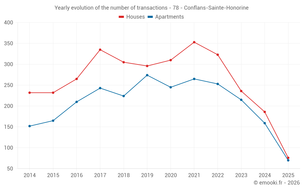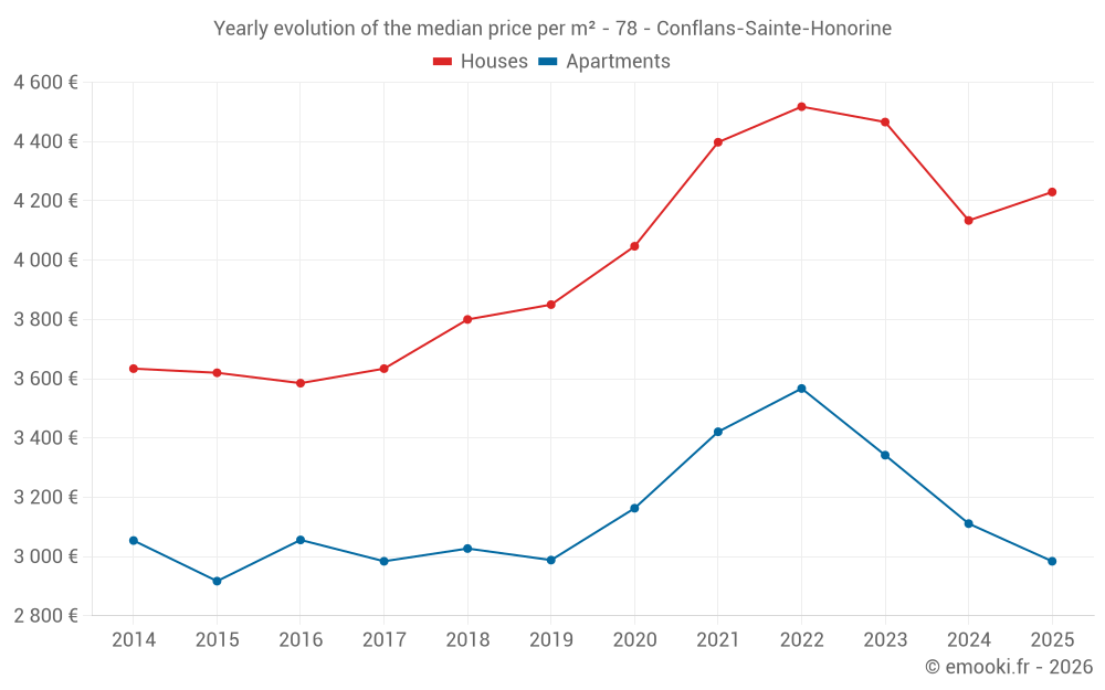 The median price on the 35 house transactions of the last 3 months in the municipality of Conflans-Sainte-Honorine was 4 194 € per square meter for a median property value of 400 000 €. Over this period, 60% of transactions were between 3 483 and 5 402 € per square meter (from the 2nd to the 8th deciles).