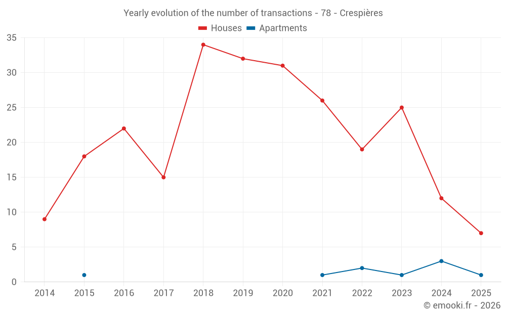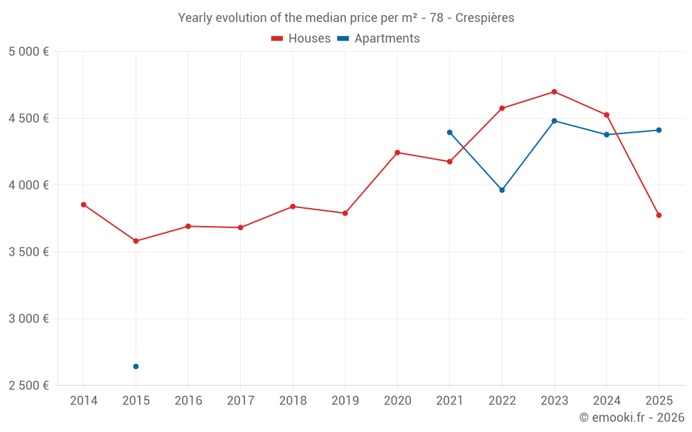 The median price on the 33 house transactions of the last 24 months in the municipality of Crespières was 3 963 € per square meter for a median property value of 546 750 €. Over this period, 60% of transactions were between 3 172 and 4 885 € per square meter (from the 2nd to the 8th deciles).