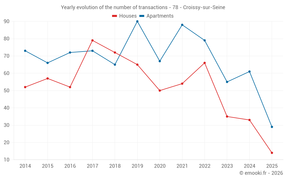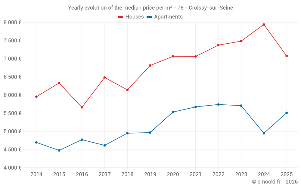 The median price on the 27 house transactions of the last 12 months in the municipality of Croissy-sur-Seine was 8 326 € per square meter for a median property value of 965 550 €. Over this period, 60% of transactions were between 6 607 and 9 778 € per square meter (from the 2nd to the 8th deciles).