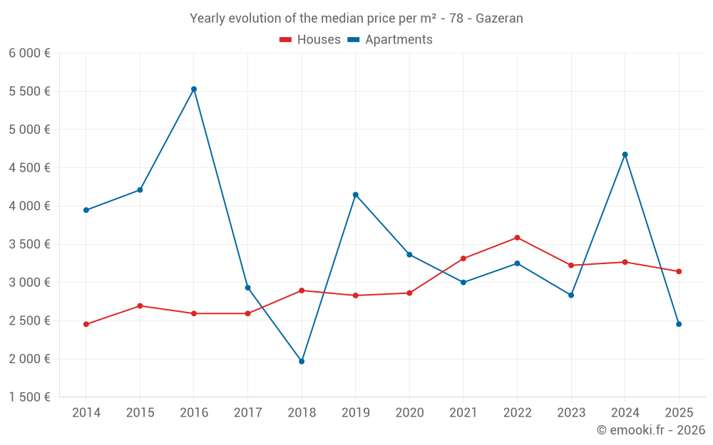 The median price on the 23 house transactions of the last 24 months in the municipality of Gazeran was 3 267 € per square meter for a median property value of 380 000 €. Over this period, 60% of transactions were between 2 726 and 3 709 € per square meter (from the 2nd to the 8th deciles).