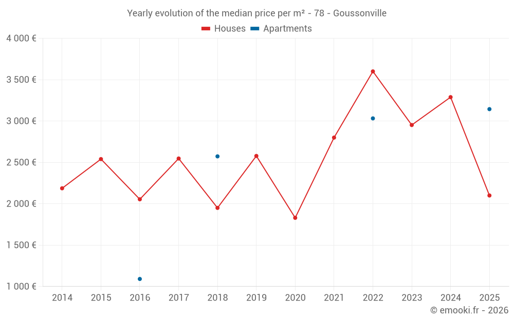 The median price on the 18 house transactions of the last 24 months in the municipality of Goussonville was 3 060 € per square meter for a median property value of 319 000 €. Over this period, 60% of transactions were between 2 200 and 3 682 € per square meter (from the 2nd to the 8th deciles).