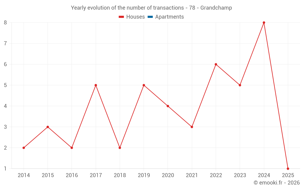 The median price on the 14 house transactions of the last 24 months in the municipality of Grandchamp was 2 788 € per square meter for a median property value of 331 614 €. Over this period, 60% of transactions were between 1 753 and 3 942 € per square meter (from the 2nd to the 8th deciles).