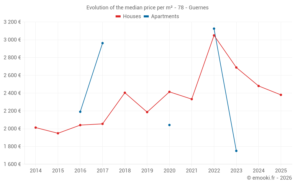 The median price on the 23 house transactions of the last 24 months in the municipality of Guernes was 2 500 € per square meter for a median property value of 220 000 €. Over this period, 60% of transactions were between 1 906 and 2 855 € per square meter (from the 2nd to the 8th deciles).