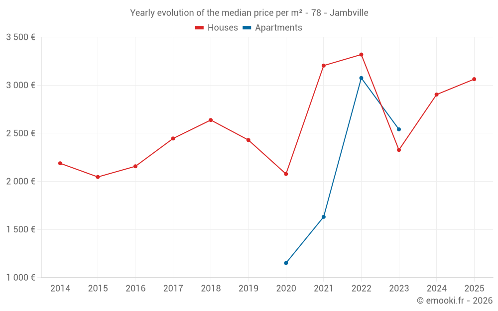 The median price on the 17 house transactions of the last 24 months in the municipality of Jambville was 3 063 € per square meter for a median property value of 339 000 €. Over this period, 60% of transactions were between 2 029 and 3 404 € per square meter (from the 2nd to the 8th deciles).