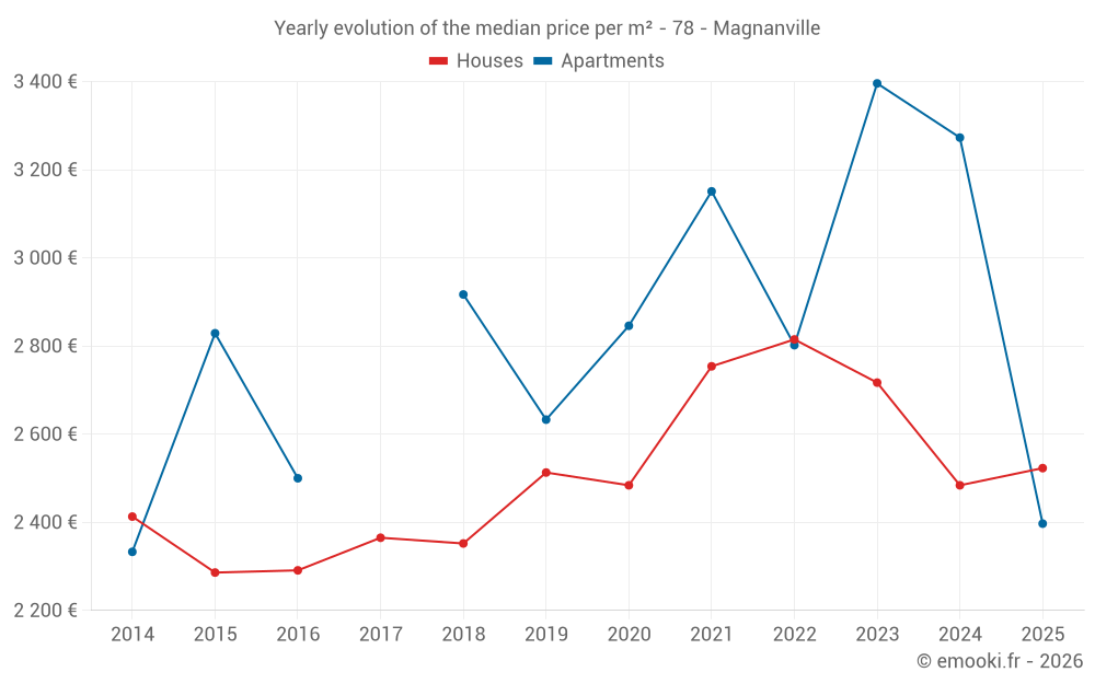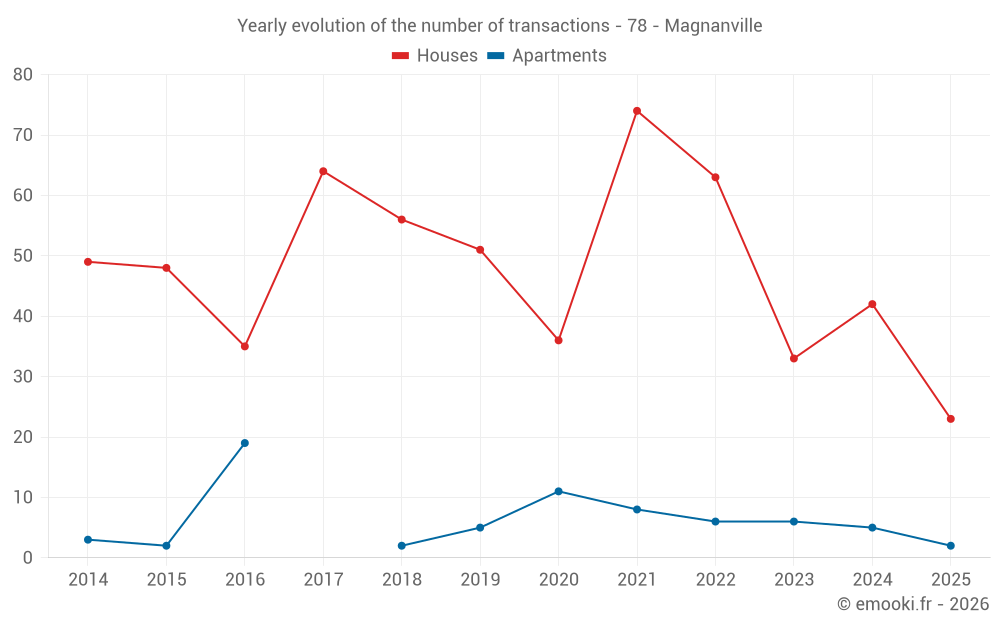 The median price on the 23 house transactions of the last 6 months in the municipality of Magnanville was 2 523 € per square meter for a median property value of 255 580 €. Over this period, 60% of transactions were between 2 255 and 2 883 € per square meter (from the 2nd to the 8th deciles).