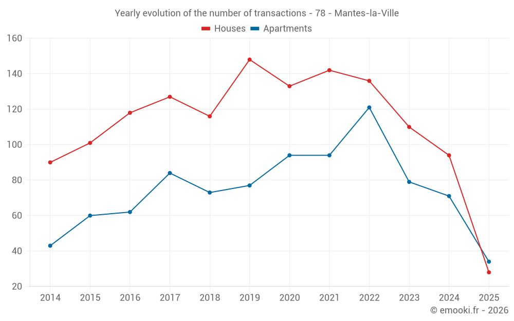 The median price on the 28 house transactions of the last 6 months in the municipality of Mantes-la-Ville was 2 426 € per square meter for a median property value of 219 325 €. Over this period, 60% of transactions were between 2 187 and 2 717 € per square meter (from the 2nd to the 8th deciles).