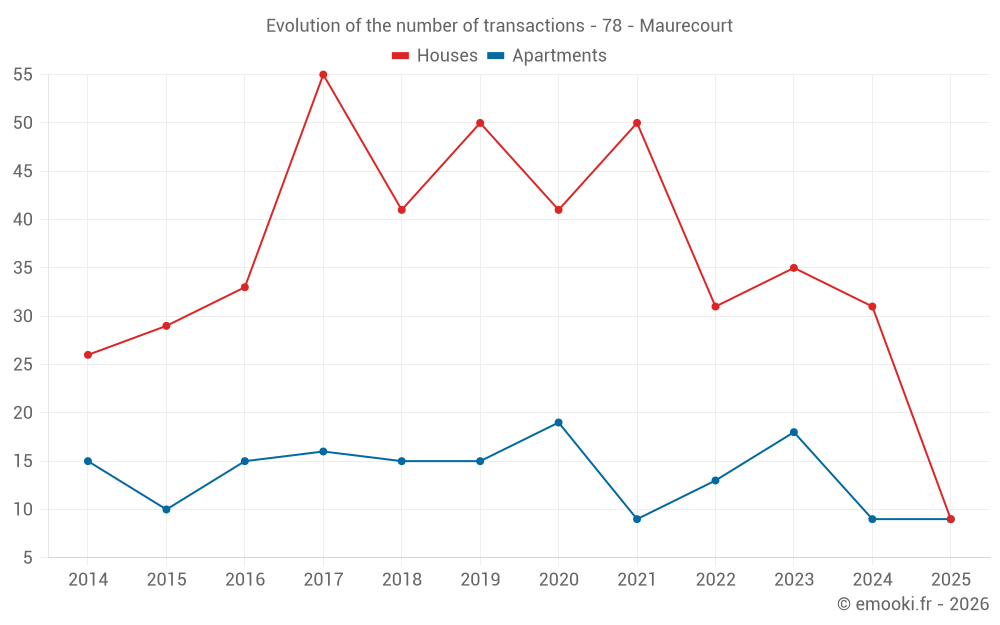 The median price on the 25 house transactions of the last 12 months in the municipality of Maurecourt was 3 280 € per square meter for a median property value of 361 150 €. Over this period, 60% of transactions were between 2 722 and 4 614 € per square meter (from the 2nd to the 8th deciles).