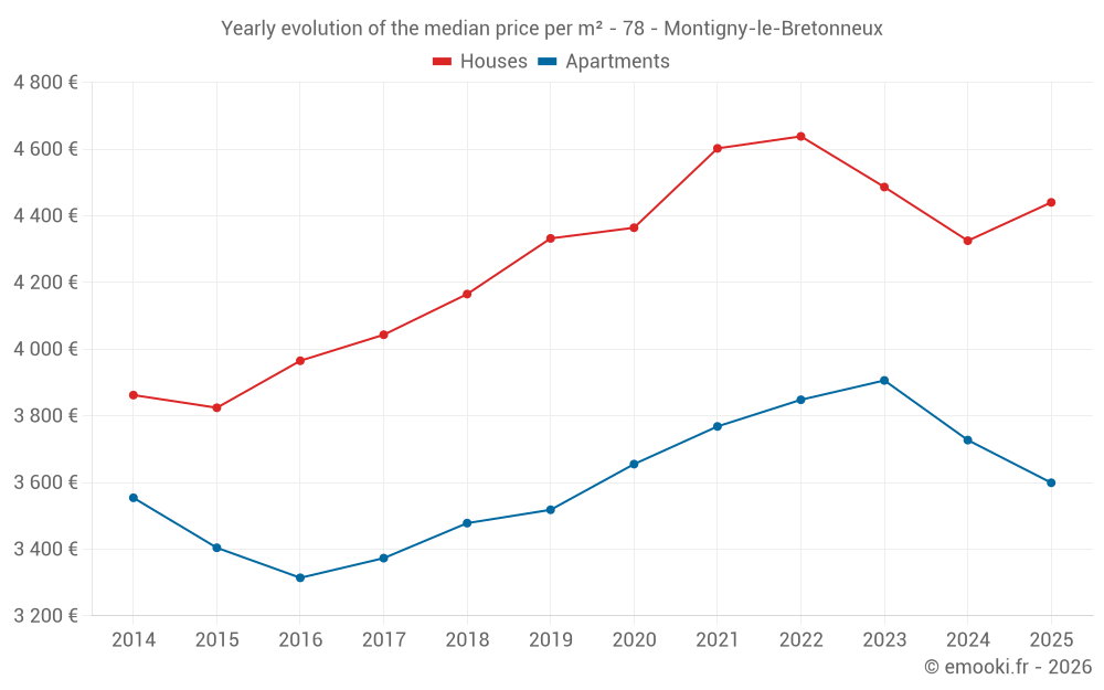 The median price on the 28 house transactions of the last 6 months in the municipality of Montigny-le-Bretonneux was 4 440 € per square meter for a median property value of 435 500 €. Over this period, 60% of transactions were between 4 001 and 5 084 € per square meter (from the 2nd to the 8th deciles).