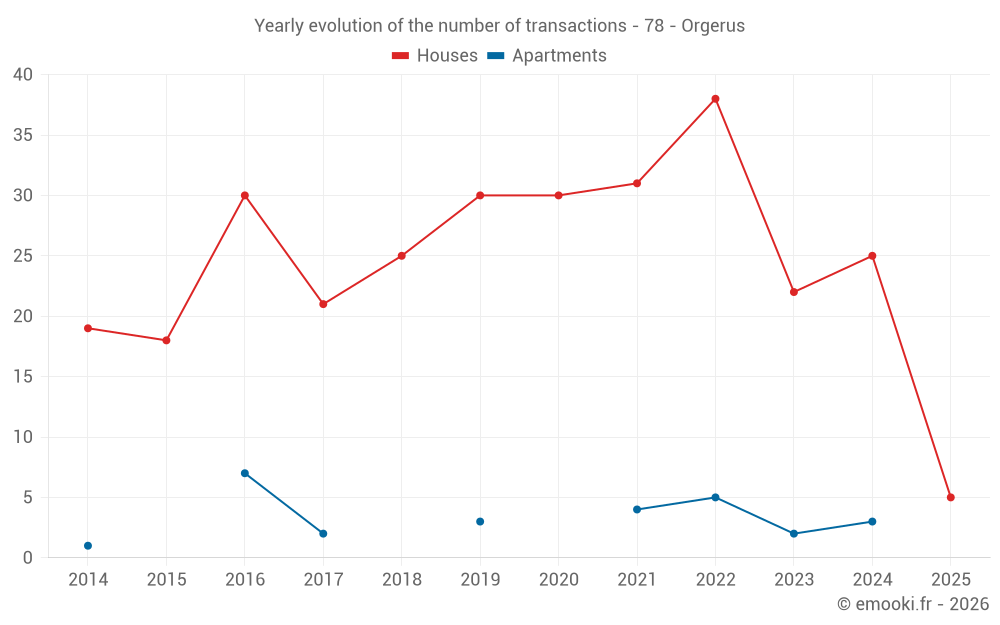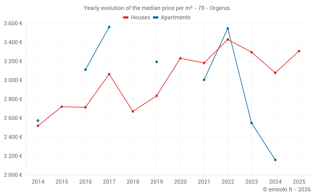 The median price on the 18 house transactions of the last 12 months in the municipality of Orgerus was 3 060 € per square meter for a median property value of 275 000 €. Over this period, 60% of transactions were between 2 664 and 3 726 € per square meter (from the 2nd to the 8th deciles).