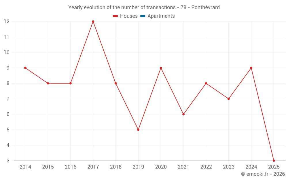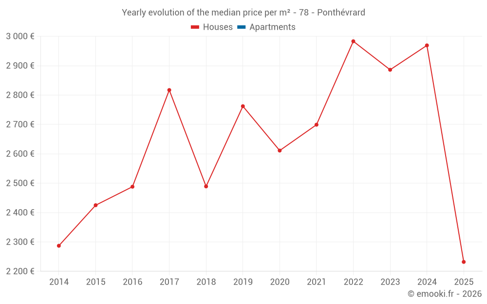 The median price on the 16 house transactions of the last 24 months in the municipality of Ponthévrard was 2 784 € per square meter for a median property value of 327 500 €. Over this period, 60% of transactions were between 2 235 and 3 185 € per square meter (from the 2nd to the 8th deciles).