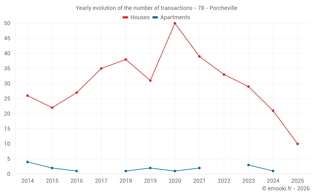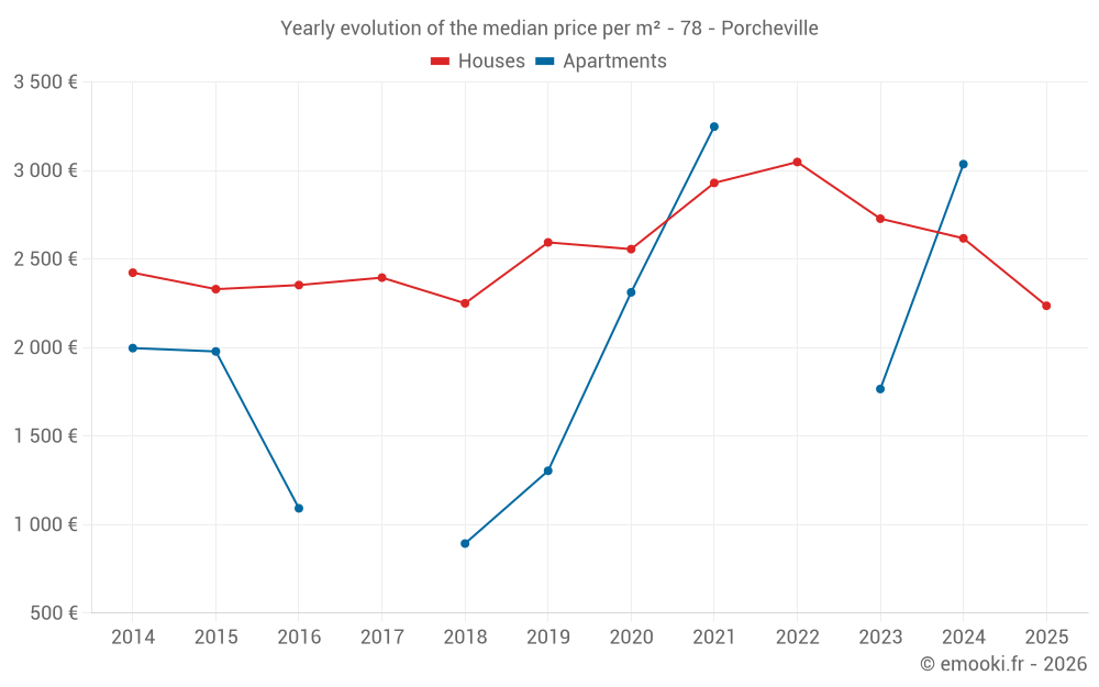 The median price on the 21 house transactions of the last 12 months in the municipality of Porcheville was 2 635 € per square meter for a median property value of 250 000 €. Over this period, 60% of transactions were between 2 012 and 3 000 € per square meter (from the 2nd to the 8th deciles).
