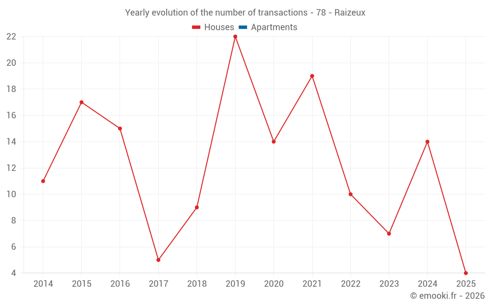 The median price on the 22 house transactions of the last 24 months in the municipality of Raizeux was 2 712 € per square meter for a median property value of 315 100 €. Over this period, 60% of transactions were between 2 003 and 4 118 € per square meter (from the 2nd to the 8th deciles).