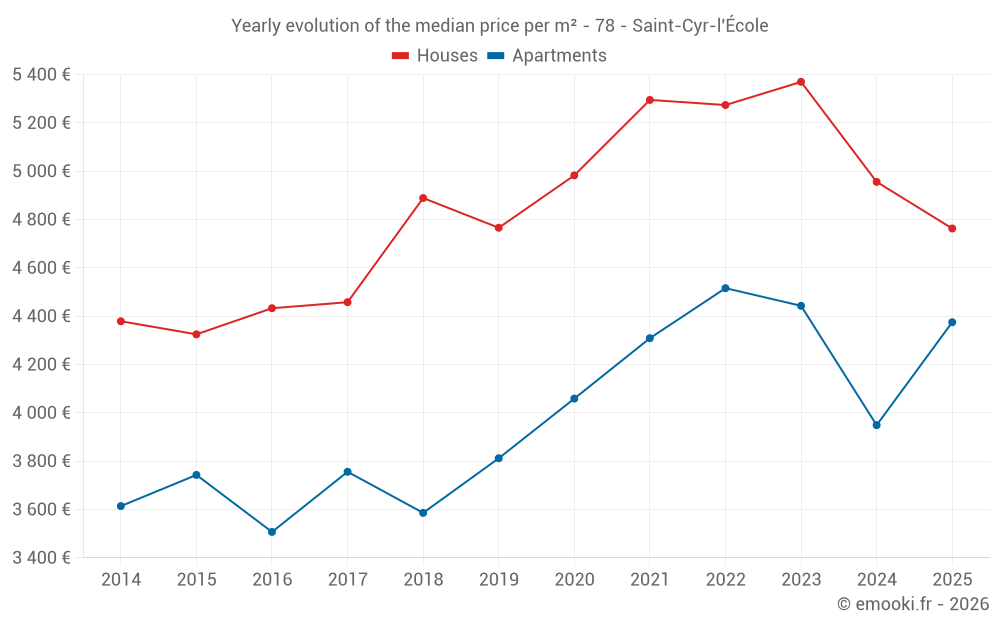 The median price on the 28 house transactions of the last 6 months in the municipality of Saint-Cyr-l'École was 4 766 € per square meter for a median property value of 454 500 €. Over this period, 60% of transactions were between 4 287 and 5 189 € per square meter (from the 2nd to the 8th deciles).