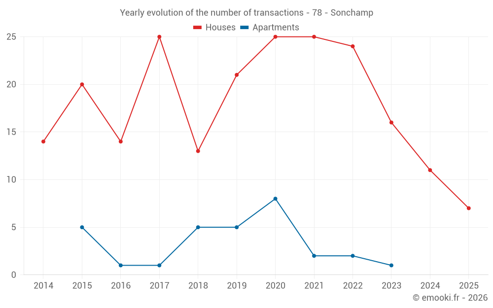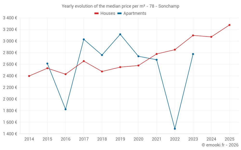 The median price on the 24 house transactions of the last 24 months in the municipality of Sonchamp was 3 080 € per square meter for a median property value of 304 290 €. Over this period, 60% of transactions were between 2 504 and 3 574 € per square meter (from the 2nd to the 8th deciles).