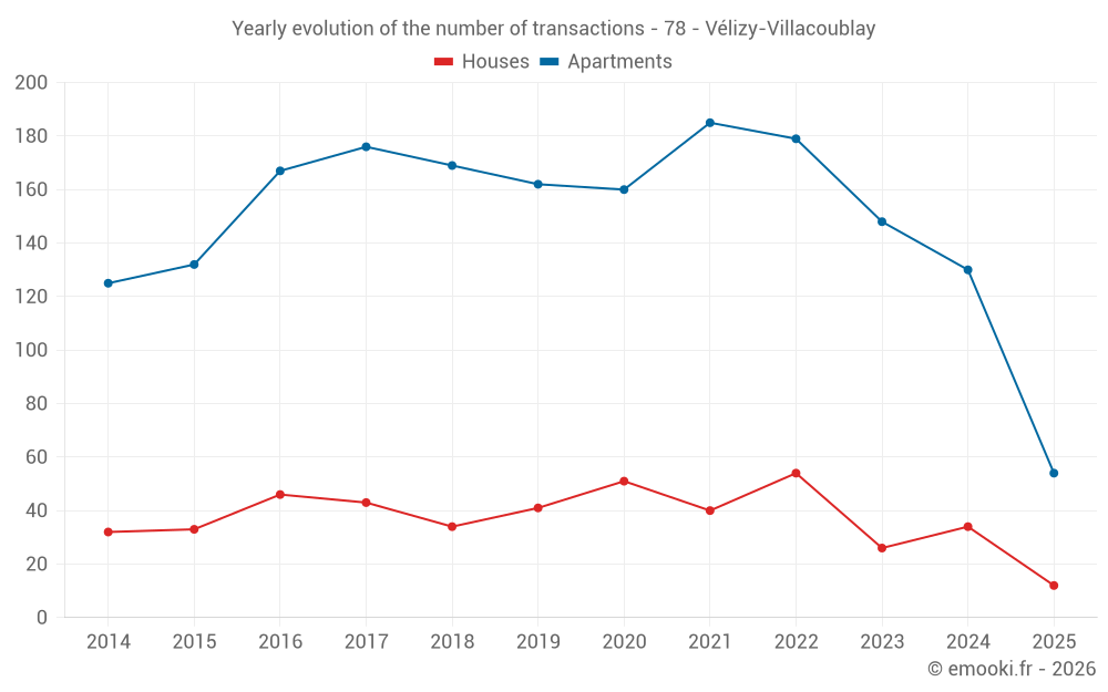 The median price on the 34 house transactions of the last 12 months in the municipality of Vélizy-Villacoublay was 6 290 € per square meter for a median property value of 530 000 €. Over this period, 60% of transactions were between 4 781 and 7 586 € per square meter (from the 2nd to the 8th deciles).