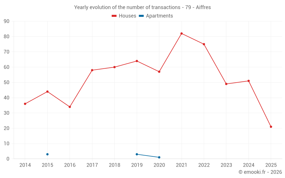 The median price on the 21 house transactions of the last 6 months in the municipality of Aiffres was 1 750 € per square meter for a median property value of 210 040 €. Over this period, 60% of transactions were between 1 500 and 2 312 € per square meter (from the 2nd to the 8th deciles).