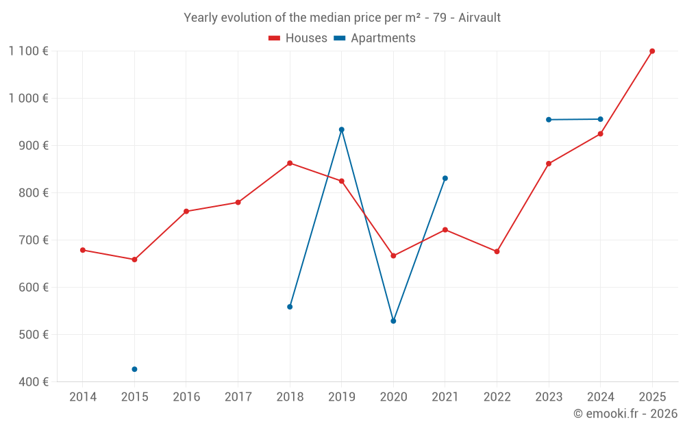 The median price on the 40 house transactions of the last 12 months in the municipality of Airvault was 1 002 € per square meter for a median property value of 86 670 €. Over this period, 60% of transactions were between 488 and 1 366 € per square meter (from the 2nd to the 8th deciles).