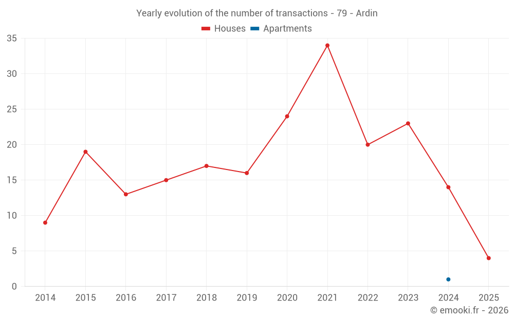 The median price on the 32 house transactions of the last 24 months in the municipality of Ardin was 1 138 € per square meter for a median property value of 133 000 €. Over this period, 60% of transactions were between 783 and 1 649 € per square meter (from the 2nd to the 8th deciles).