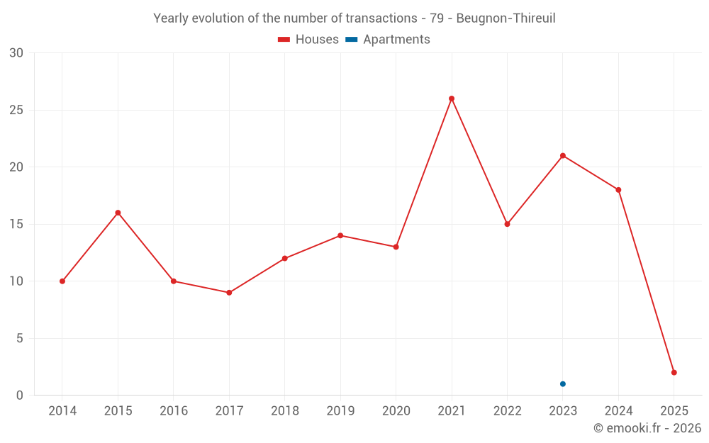 The median price on the 28 house transactions of the last 24 months in the municipality of Beugnon-Thireuil was 863 € per square meter for a median property value of 98 800 €. Over this period, 60% of transactions were between 464 and 1 298 € per square meter (from the 2nd to the 8th deciles).