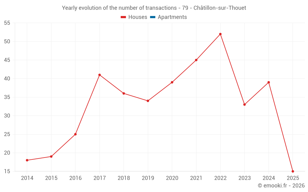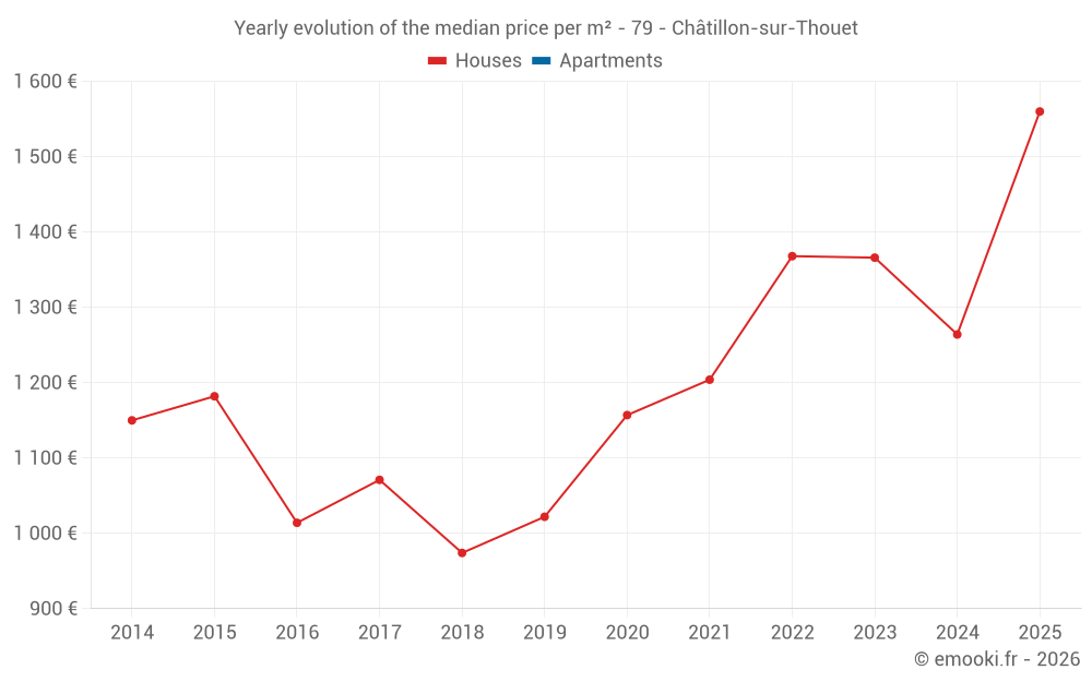 The median price on the 34 house transactions of the last 12 months in the municipality of Châtillon-sur-Thouet was 1 476 € per square meter for a median property value of 117 500 €. Over this period, 60% of transactions were between 1 077 and 1 800 € per square meter (from the 2nd to the 8th deciles).